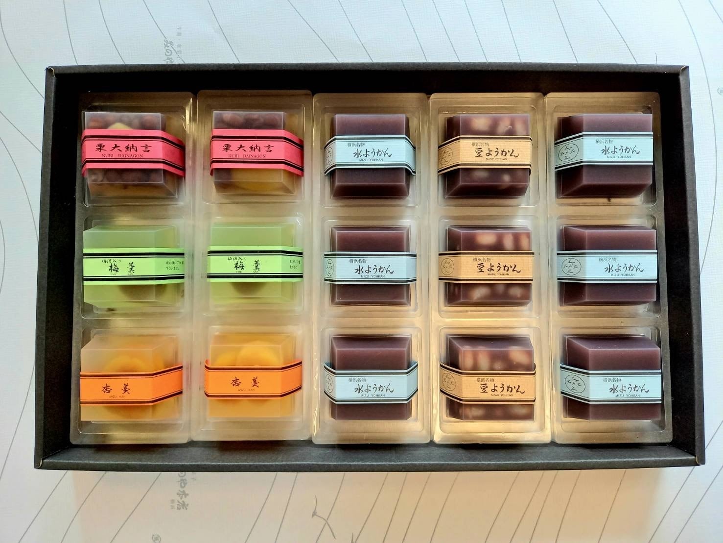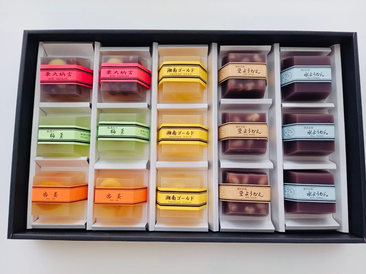 ★水ようかん6個、豆ようかん3個、栗大納言2個、杏羮2個、梅羮2個が入った15個入り。